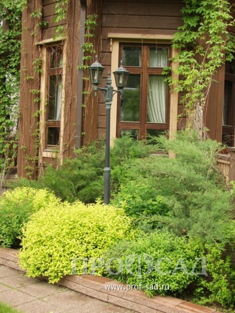 Внимания заслуживают так называемые «периметральные» цветники, поднятые над уровнем земли. По сути дела, это подпорная стенка, расположенная на расстоянии около полутора метров от стены дома, высотой около тридцати сантиметров. Корыто цветника засыпается плодородным грунтом и засаживается растениями. В нашем случае такие цветники устроены почти по всему периметру дома. В них расположились независимые друг от друга композиции: сад спирей, сад астильб, теневой сад. Эти композиции никак не связаны друг с другом, но зато связаны с примыкающими к ним участками сада, главным образом за счёт того, что присутствующие в них растения «покидают» границы цветника и появляются в соседних композициях.
