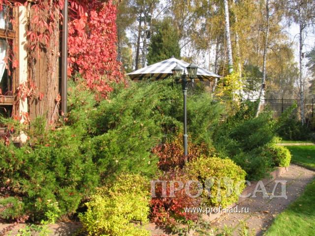 Ассортимент растений данного участка позволяет в течение всего сезона иметь эффектные виды, открывающиеся с дорожек, с террасы, из окон: весной - буйство цветения луковичных, чуть позже зацветают рододендроны, летом - спиреи, розы, многолетники, осенью поражают окраской листьев виноград девичий, бересклет крылатый и спиреи, а сад вовсю светится жёлтыми грушами и красными яблоками, и наконец, зимой рассредоточенные по всему саду хвойные продолжают украшать его.