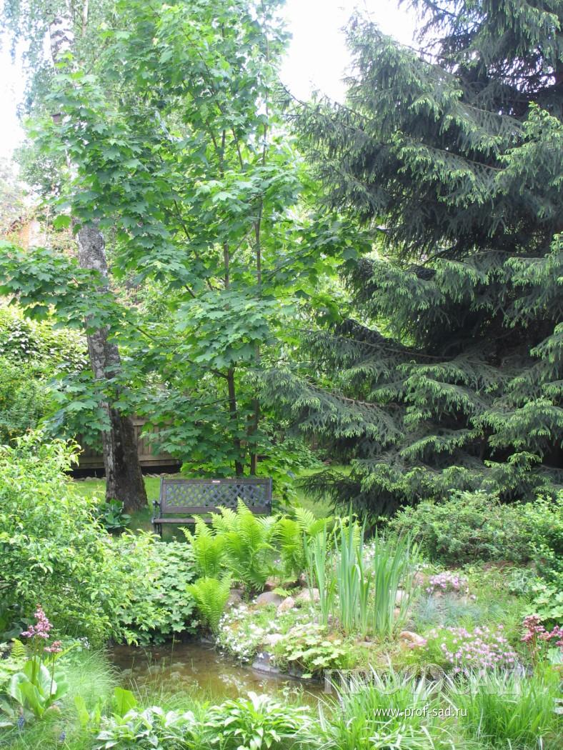 Другой интересной частью участка является рокарий с небольшим водоёмом, расположенным у подножия гостевого домика. Сам домик - неброская избушка, и ландшафт около него был сделан соответствующий, неброский, и лаконичный. Среди камней виднеется небольшое озерцо, которое ожерельем окружают неприхотливые почвопокровные и прибрежные растения. В течение всего сезона на этом участке то вспыхивают розовыми огоньками баданы, то появляются розово-белые ковры флокса шиловидного, то оранжево-красной пеной зацветает хеномелес, то выбрасывают свои цветы-бабочки ирисы. Сам домик увит девичьим виноградом, что создаёт неповторимый уют. Надо заметить, что именно этот кусочек сада - излюбленное место для животных в саду. В жаркие дни здесь можно встретить самых разнообразных птиц, прилетевших испить воды, нередки ежи, прячущиеся под террасой домика, водоём полюбили тритоны и лягушки, а в воздухе всегда кружат бабочки и жуки. А недавно в саду поселилась белка, устроившая себе домик в скворечнике. И это всё, конечно, должно радовать. Это говорит о том, что природа приняла то, что сделано руками человека, а значит сделано это правильно, без нарушения её законов.
