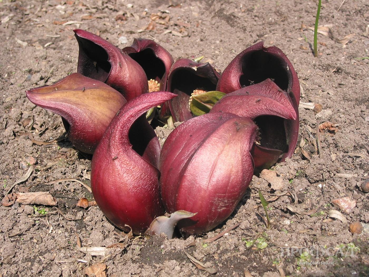 Случалось ли Вам бывать в подобном саду? Едва ли – ну так приготовьтесь к любым неожиданностям. Вот, пожалуйста, - первые обитатели! С виду они похожи на камни, но внешность обманчива (фото 1). А вот эта темно-красная птица с загнутым клювом – это уже симплокарпус, его цветок (фото 2). Прелюбопытный представитель дальневосточной флоры. И еще один – но это уже не цветы, а распускающийся папоротник дриоптерис Буша (фото 3).